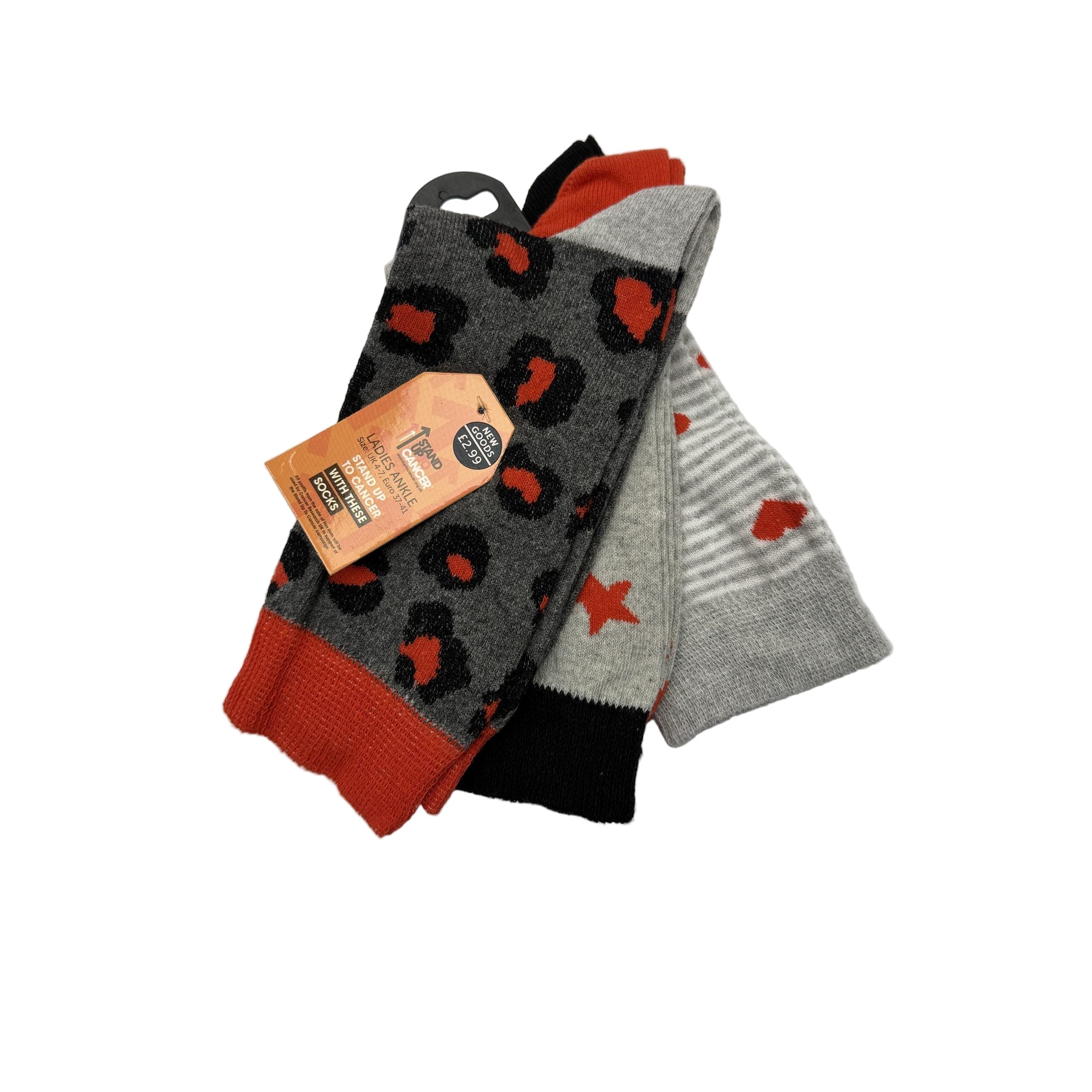 A triple pack of patterned socks that are perfect for Standing Up To Cancer.