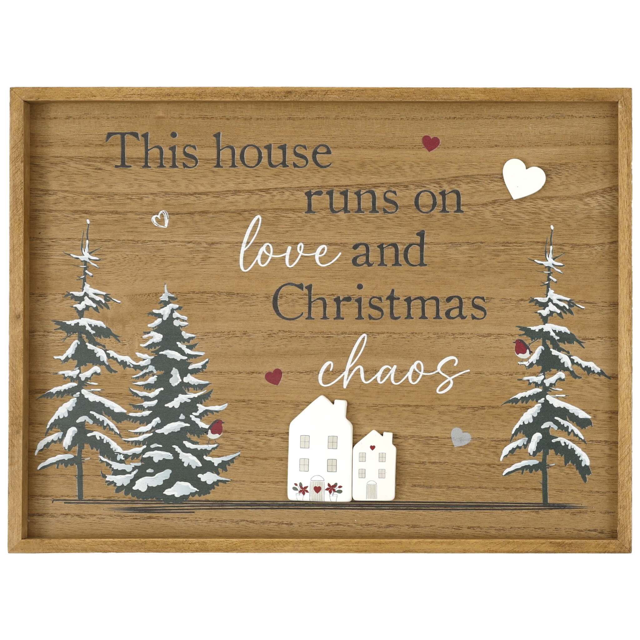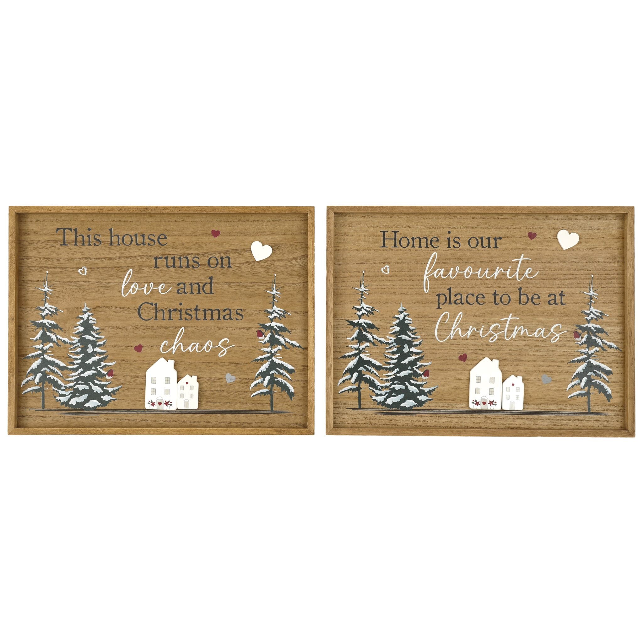 One reads: "This house runs on love and Christmas chaos", while the other reads "Home is our favourite place to be at Christmas."