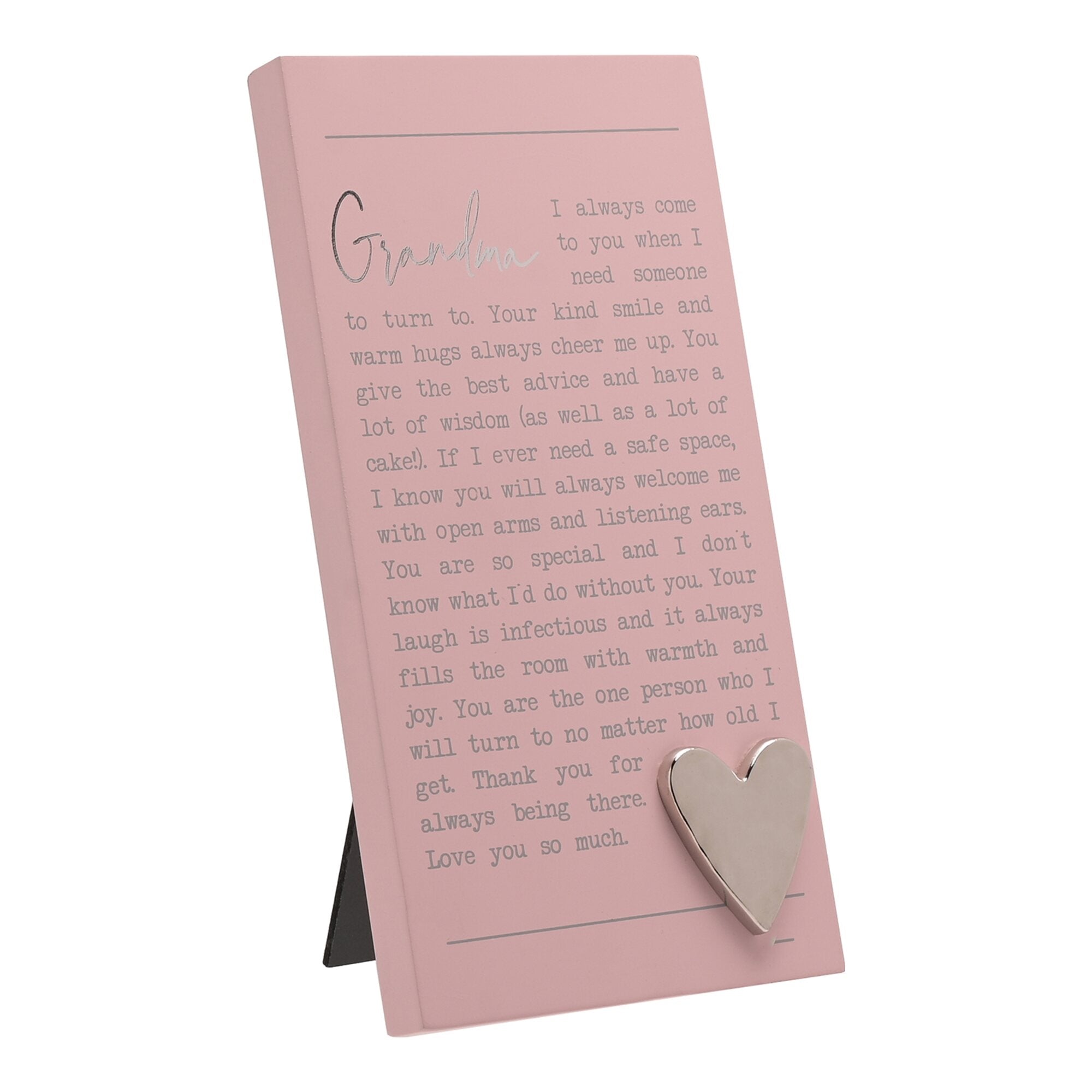 Celebrate your loving grandmother with this sentimental freestanding plaque. The pink wooden plaque is decorated with a silver metal heart embellishment.