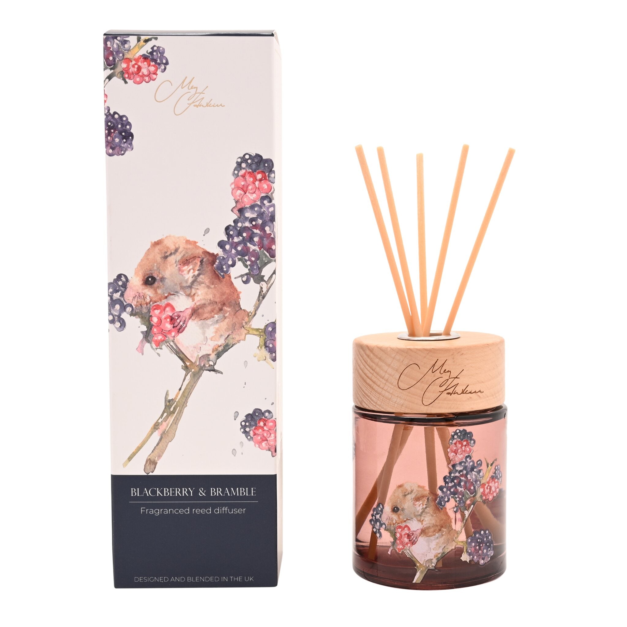 Bring a touch of fruity freshness into your home with this delightful reed diffuser, featuring a sweet watercolour mouse nestled among blackberry brambles. Its rich blackberry scent provides gentle aromatherapy benefits while helping to combat bad odours, leaving your space fresh, fruity, and inviting.
