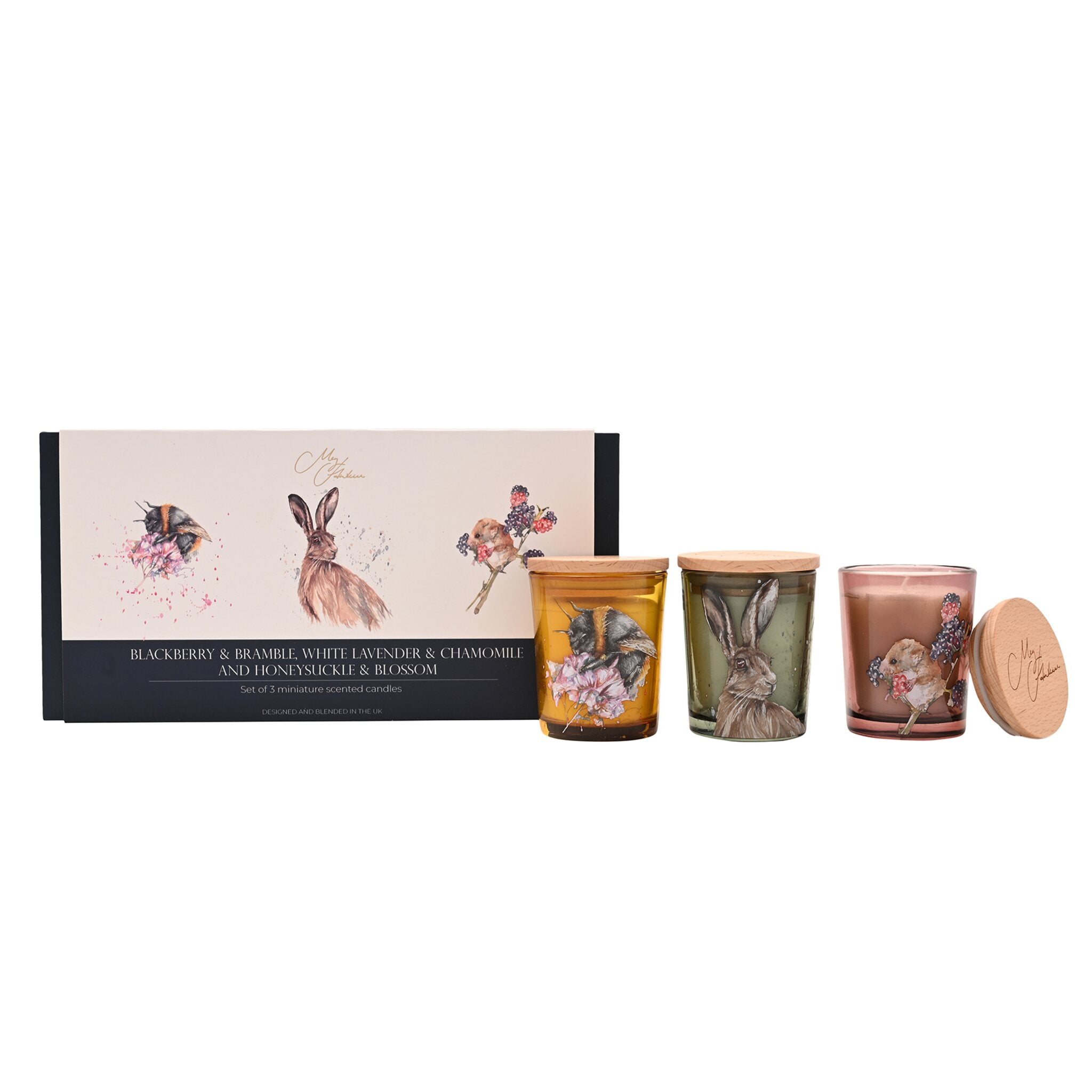 Add a sweet springtime glow to your home with this set of three mini candles, each infused with delicate berry notes and adorned with charming watercolour woodland animals. Each compact in size yet mighty in fragrance, these candles have been crafted to fill your space with comforting, long-lasting scent.